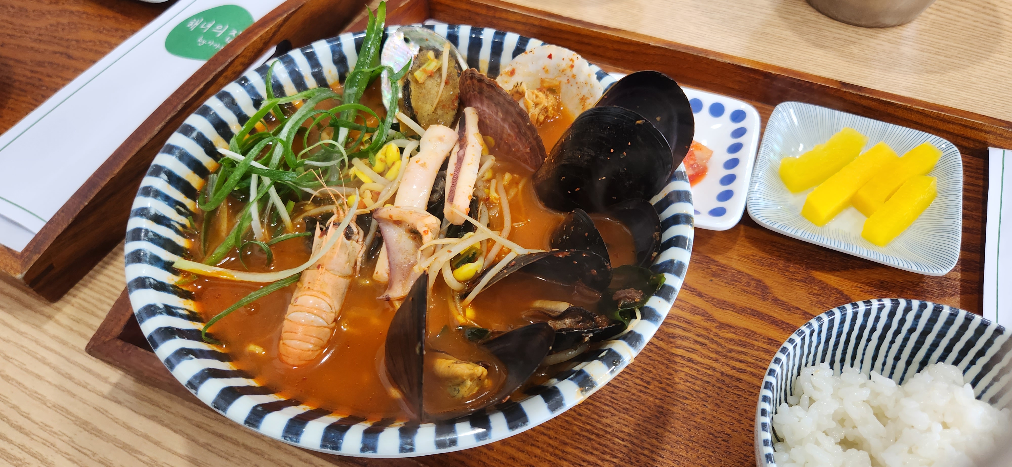 국물이 얼큰하고 해산물이 비교적 다양하게 들어 있어 든든하게 먹기 좋아요. 라면 후 국물에 밥을 말아 먹는 분들도 많아요.